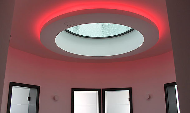 Bei dem Neubau des Bürogebäudes waren wir für den Trockenausbau inklusive Akustik zuständig. Durch Falttechnik und indirekte Beleuchtung wurden besondere Lichtakzente gesetzt.